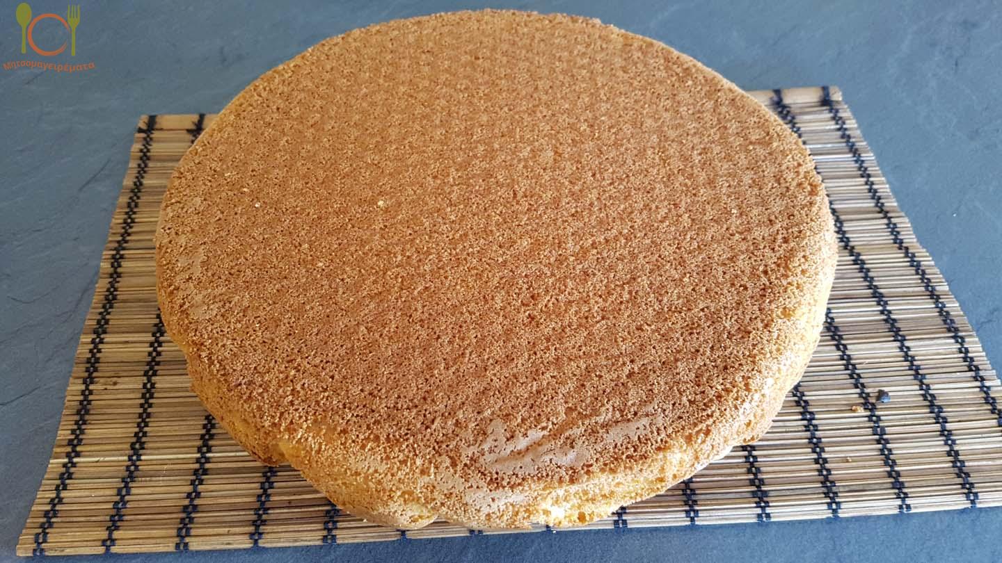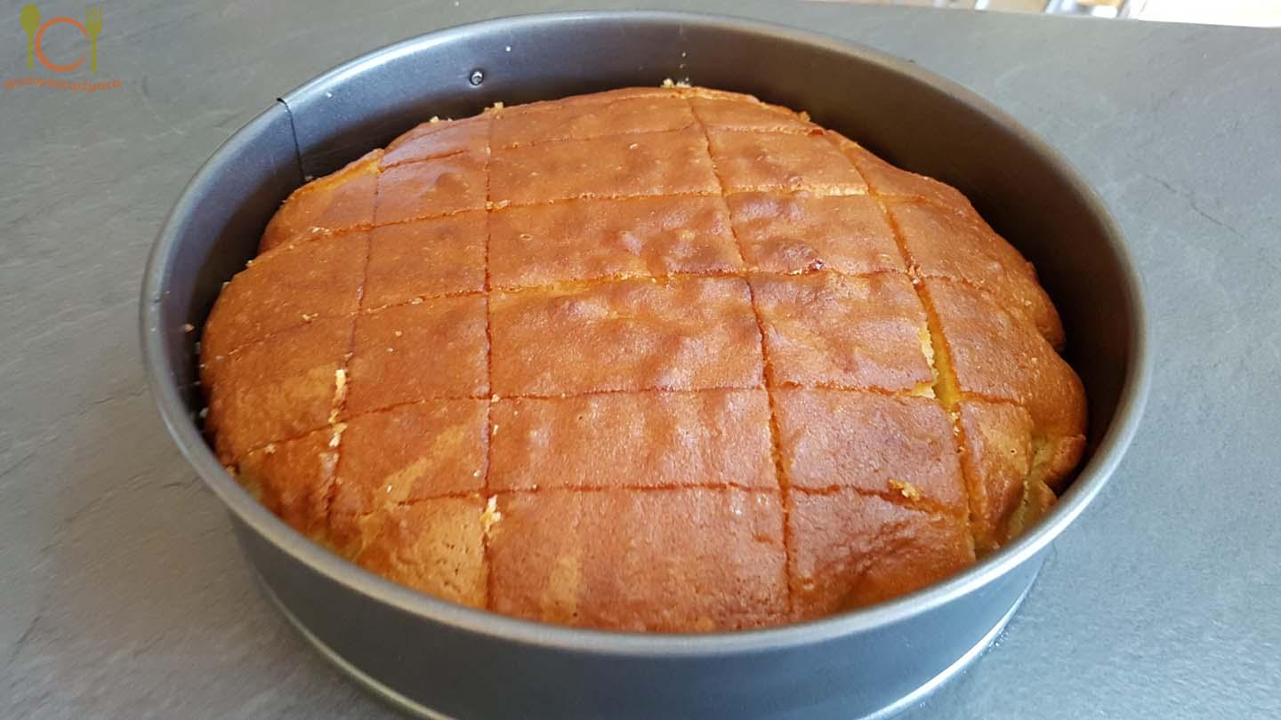 Ρίχνουμε το μείγμα σε ένα ταψάκι με λαδόκολλα, (αυτό της συνταγής έχει διάμετρο 25 εκατοστά), και το βάζουμε σε προθερμασμένο φούρνο στους 180 βαθμούς για 30 λεπτά. Το αφήνουμε να κρυώσει και μετά το σιροπιάζουμε με το καυτό σιρόπι…