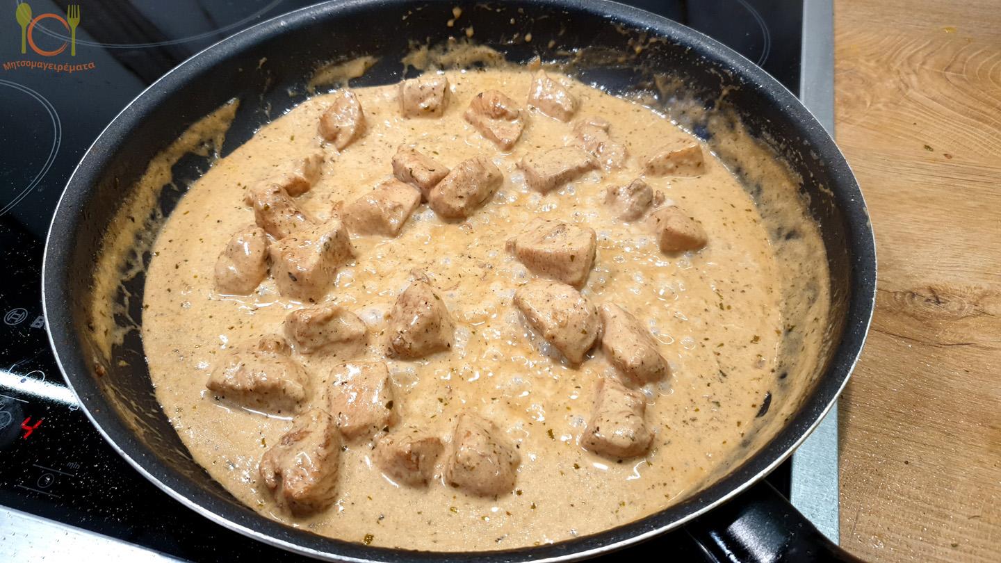 Μετά από περίπου 10 λεπτά η τηγανιά μας είναι σχεδόν έτοιμη. Βάζουμε την κρέμα γάλακτος, 200γρ με 35% λιπαρά και χαμηλώνουμε την ένταση της κουζίνας στο μισό ώστε το κοτόπουλό μας να σιγοβράσει. Θα δέσει και θα γίνει μια υπέροχη σάλτσα. Αυτό ήταν. Σερβίρουμε.