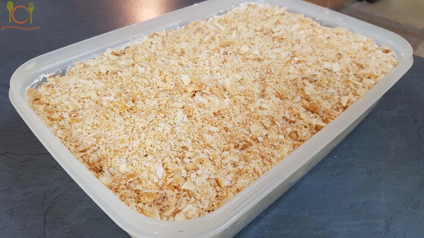 Τέλος, τρίβουμε τα σφολιατίνια, που έχουν περισσέψει, τα απλώνουμε πάνω από τη σαντιγί και το μιλφέιγ μας είναι έτοιμο!Το διατηρούμε στο ψυγείο.