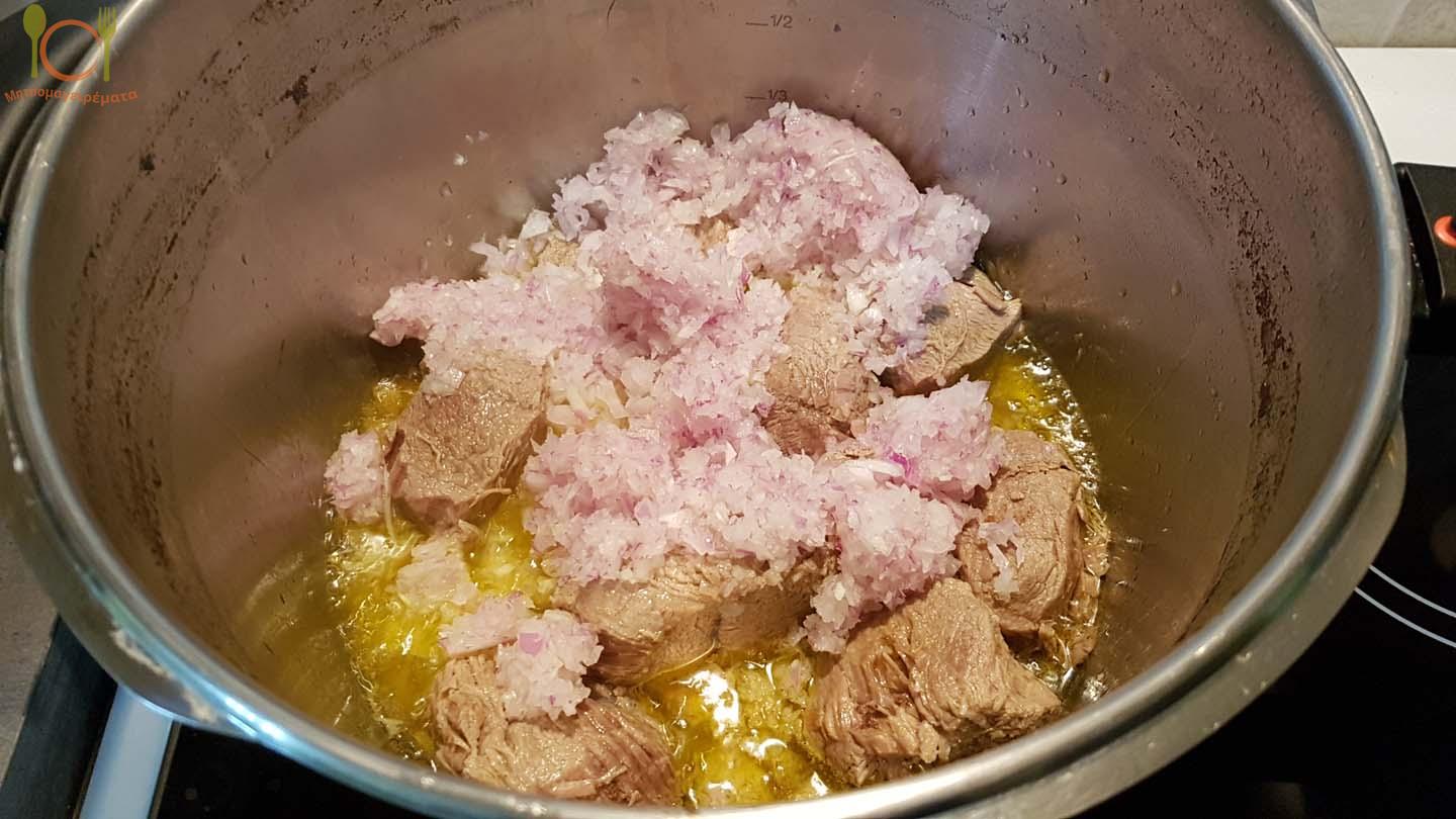 Αρχικά, βράζουμε λίγο το κρέας και το ξαφρίζουμε με μία τρυπητή κουτάλα. Όταν «καθαρίσει», το κλείνουμε στη χύτρα και το βράζουμε για 30 λεπτά. Τα 30 λεπτά τα μετράμε, αφού σηκωθεί η βαλβίδα της χύτρας.