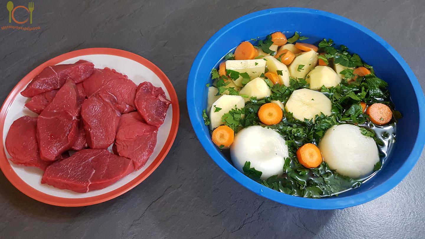 - 1 κιλό κρέας μοσχάρι (στρογγυλό ή χτένι).