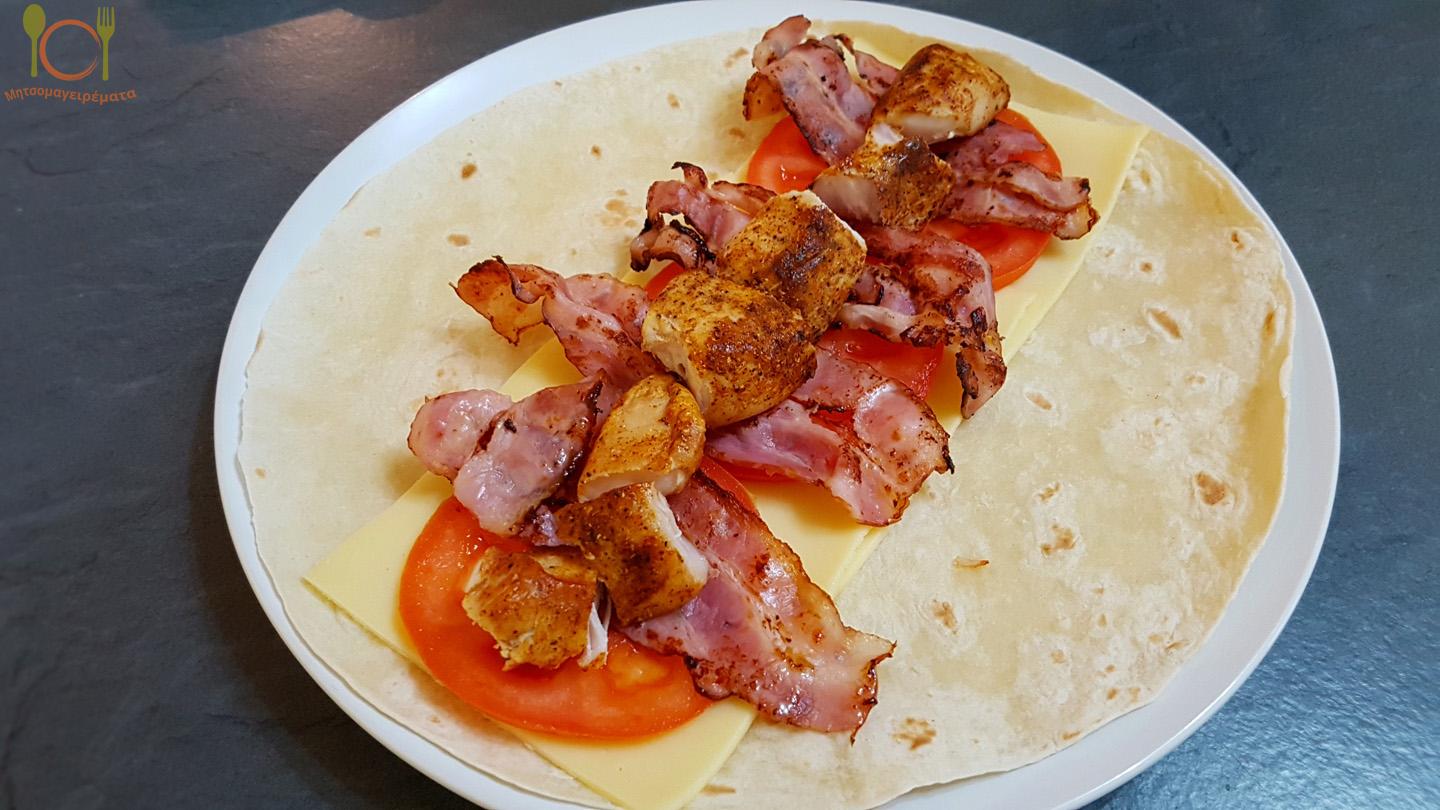 Είμαστε έτοιμοι να χτίσουμε τις τορτίγιες! Τις απλώνουμε, βάζουμε φέτες κασέρι, χοντρές, πολλές... Από πάνω ντομάτα, το μπέικον, το κοτόπουλο και τυλίγουμε σφιχτά ώστε να μην ανοίξουν οι τορτίγιες... Τις βάζουμε στην τοστιέρα και τις ψήνουμε για περίπου 5 λεπτά, μέχρι να λιώσει το κασέρι!!!